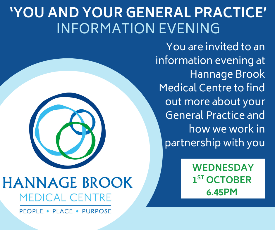 We would like to invite you to the practice to hear about Hannage Brook and how we work with you on 1st October 2025 at 6.45pm