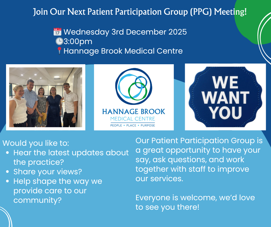Joining our PPG is a great way to provide feedback and help shape our services. We have two methods to do this to suit those that would like to attend meetings and those that would like to feedback virtually. You can be a part of both groups.